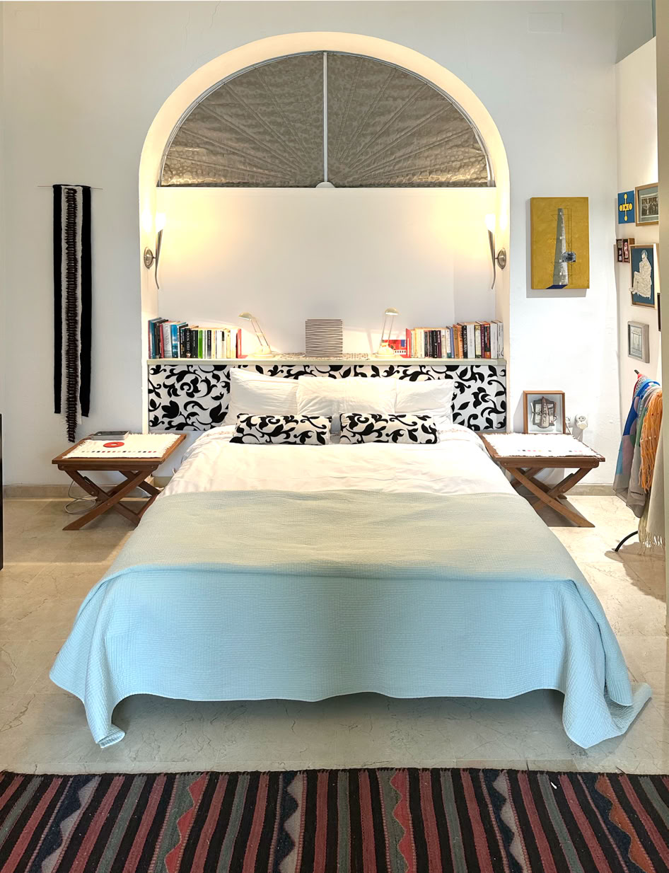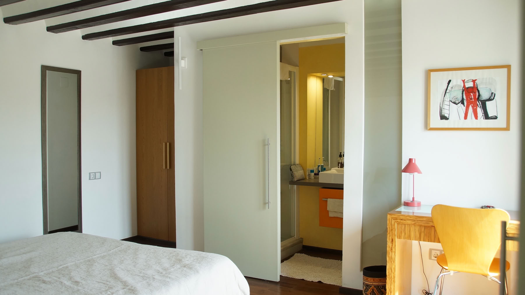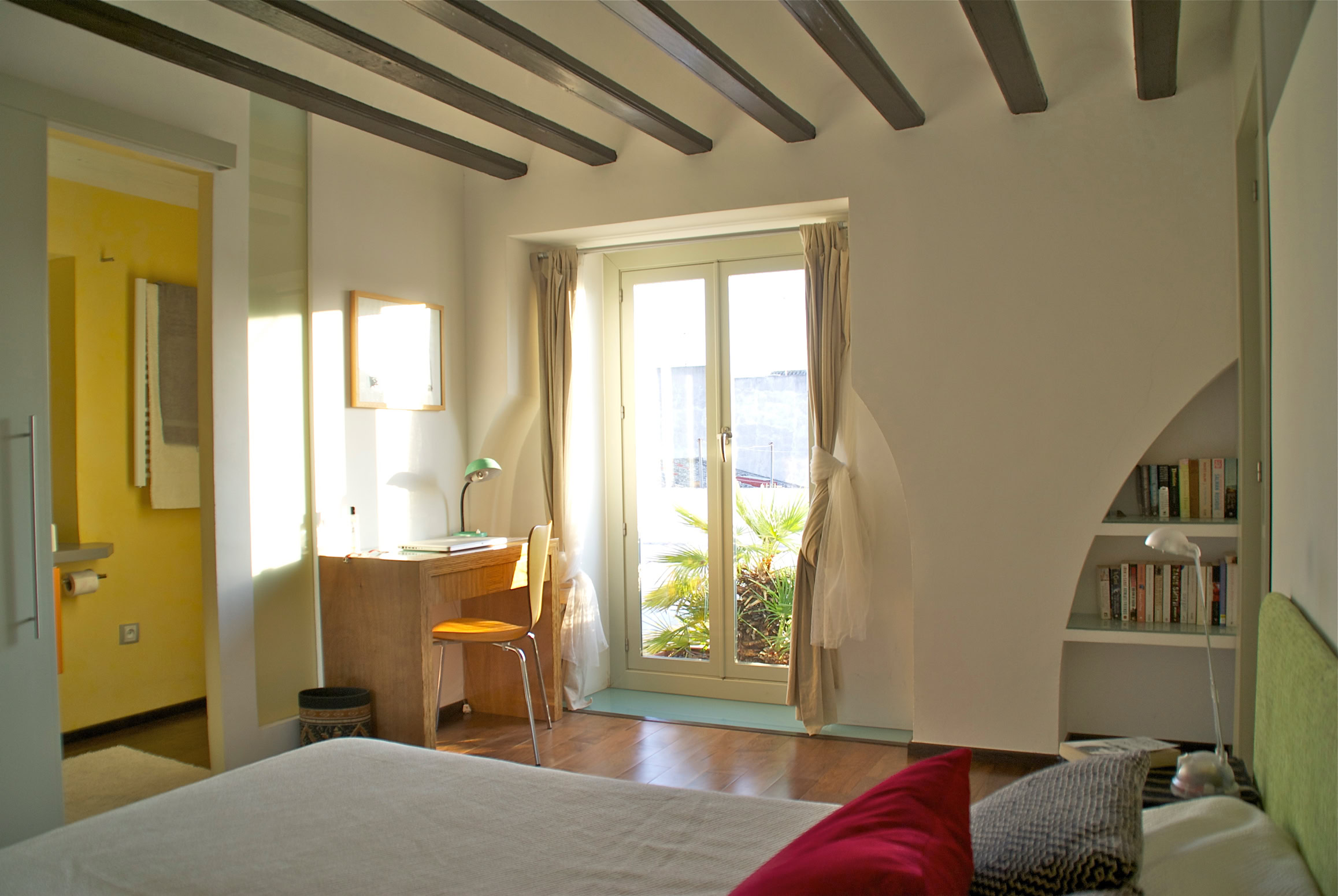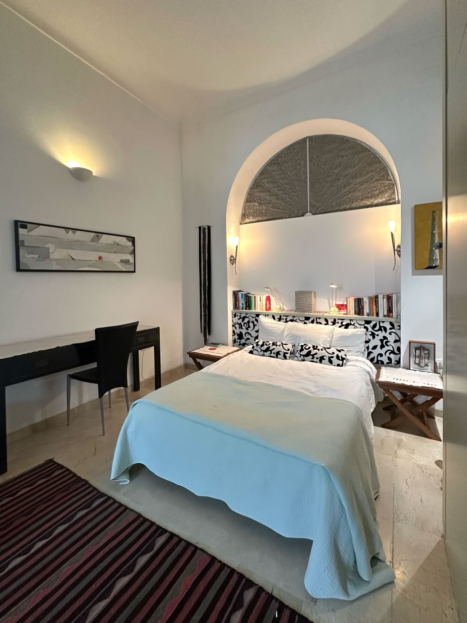 The downstairs bedroom has a double bed, a writing desk, wardrobe, small library, using the beautiful Philipe Stark equipped bathroom with its large bathtub (shower-over) sink and toilet.
