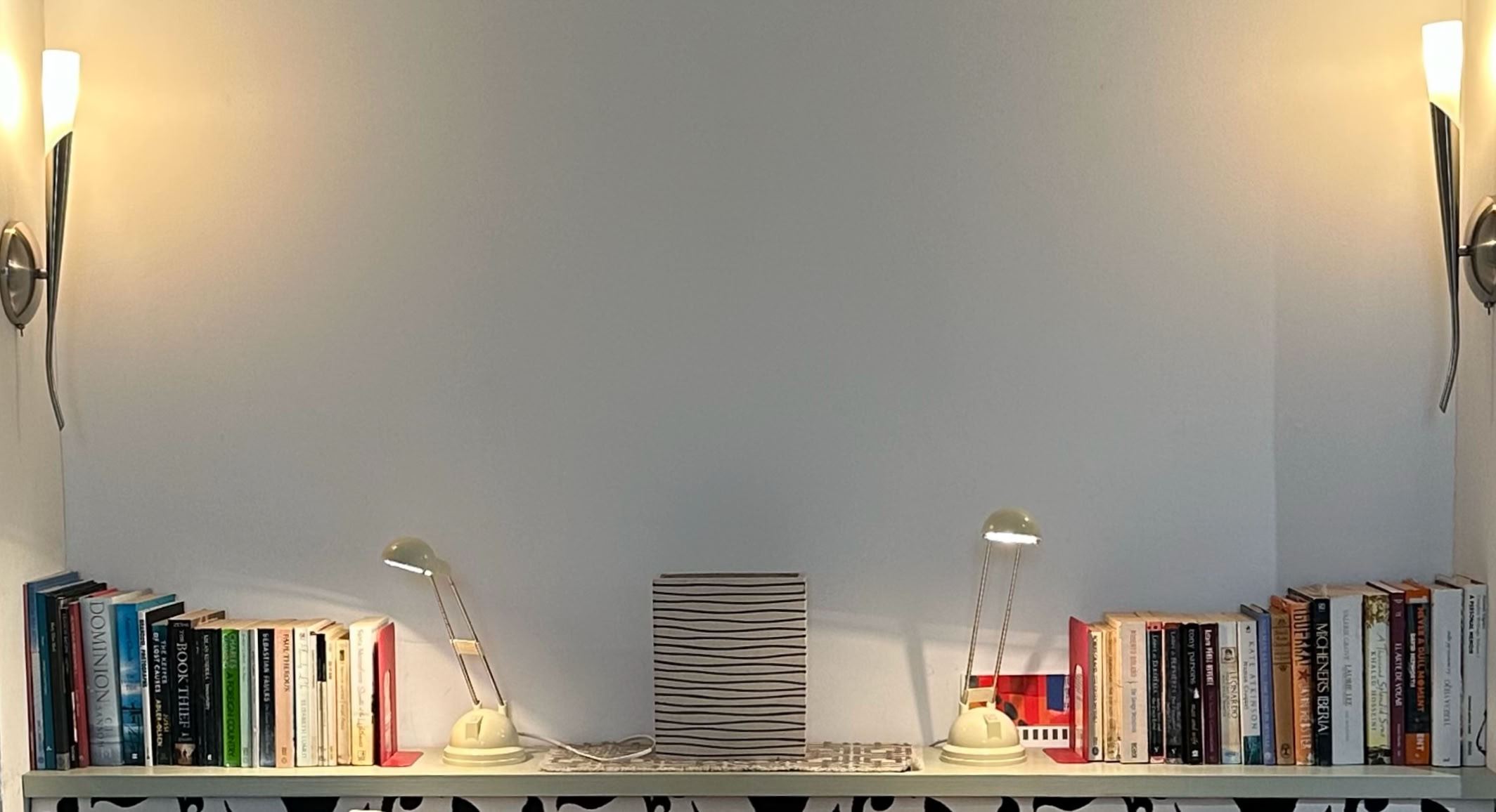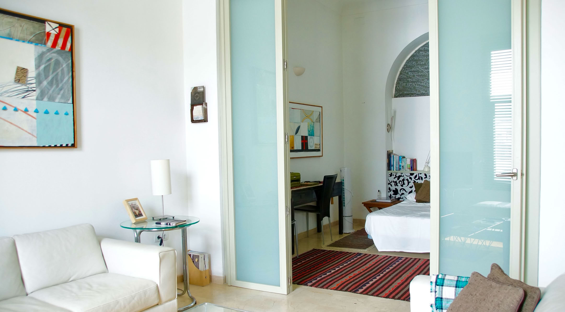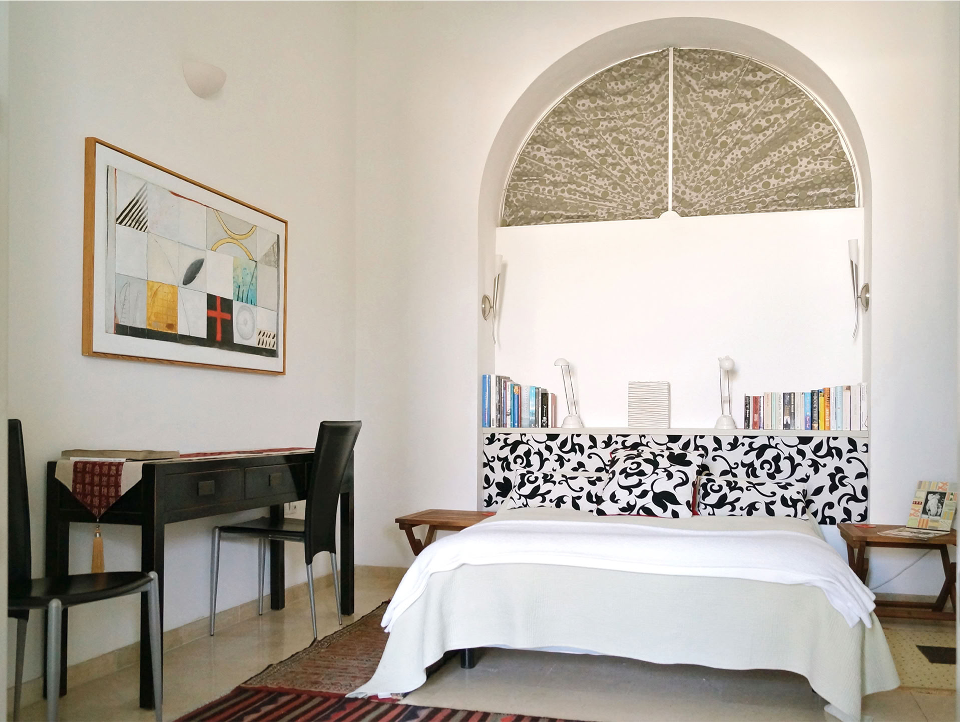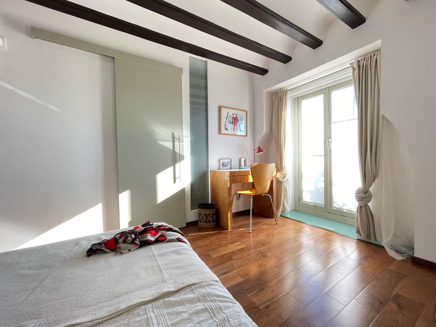 The downstairs bedroom has a double bed, a writing desk, wardrobe, small library, using the beautiful Philipe Stark equipped bathroom with its large bathtub (shower-over) sink and toilet.